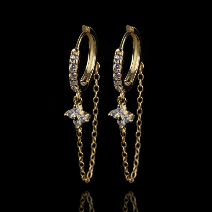 Luxusný set štyroch zlatých náušníc rôznych štýlov, ideálny na kombinovanie do viacerých dierok. Každý kúsok je ozdobený jemnými zirkónmi, ktoré dodávajú šperku žiarivý a moderný vzhľad. Set obsahuje visiacu náušnicu, minimalistickú bodku, kruh aj reťazovú náušnicu – všetky perfektne zladené pre originálny a štýlový vzhľad. Vyrobené z kvalitných materiálov pre maximálny komfort a lesk.