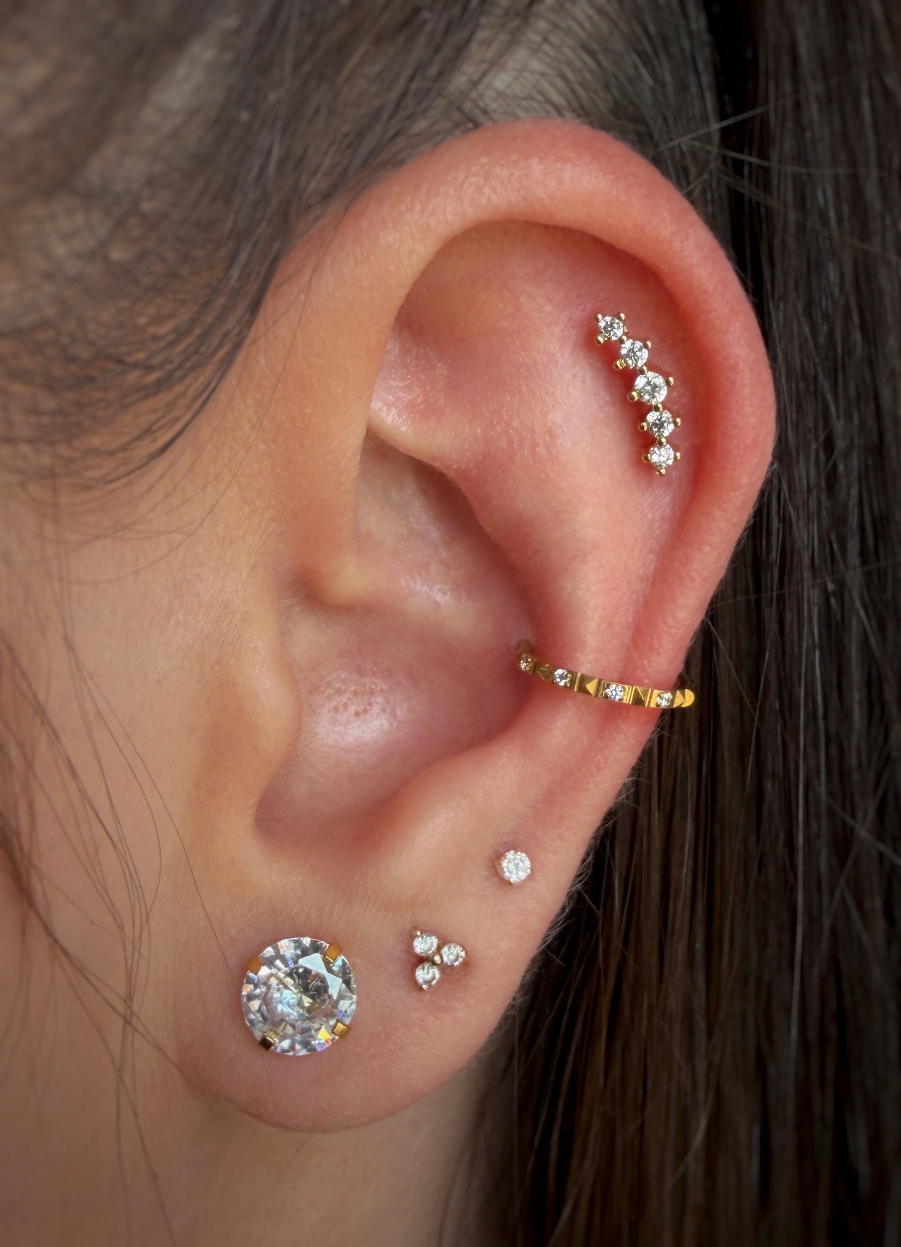 Štýlový piercing s osadeným radom kryštálov zo zirkónu doplnený zaujímavou retiazkou, ktorá pekne kopíruje ucho.
