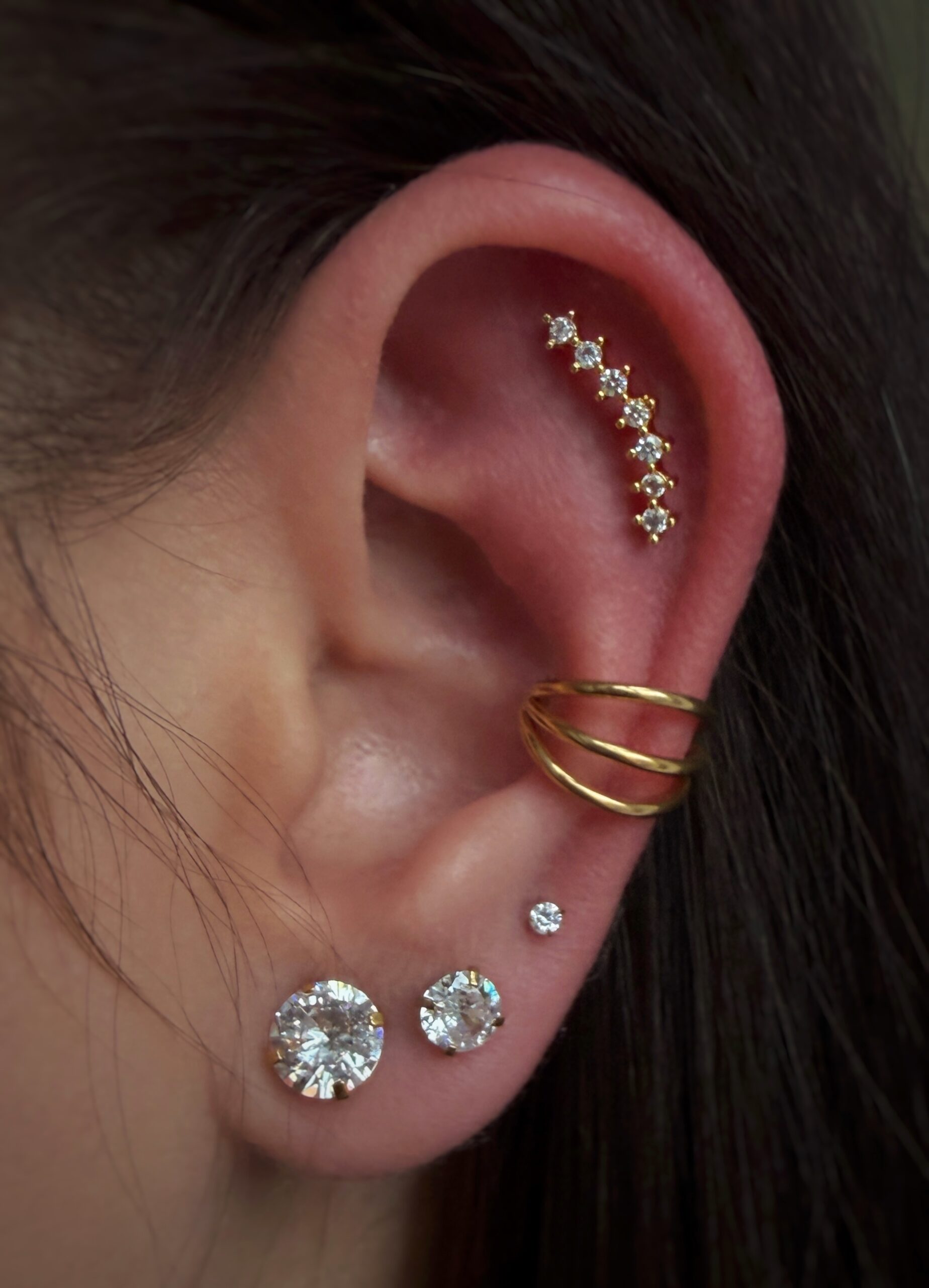 Štýlový piercing s osadeným trojitým radom kryštálov zo zirkónu. Táto obruč, navrhnutá s ohľadom na pohodlie a jednoduché použitie, je vyrobená s exkluzívnym zacvakávacím mechanizmom, vďaka ktorému je vkladanie a vyberanie veľmi jednoduché.