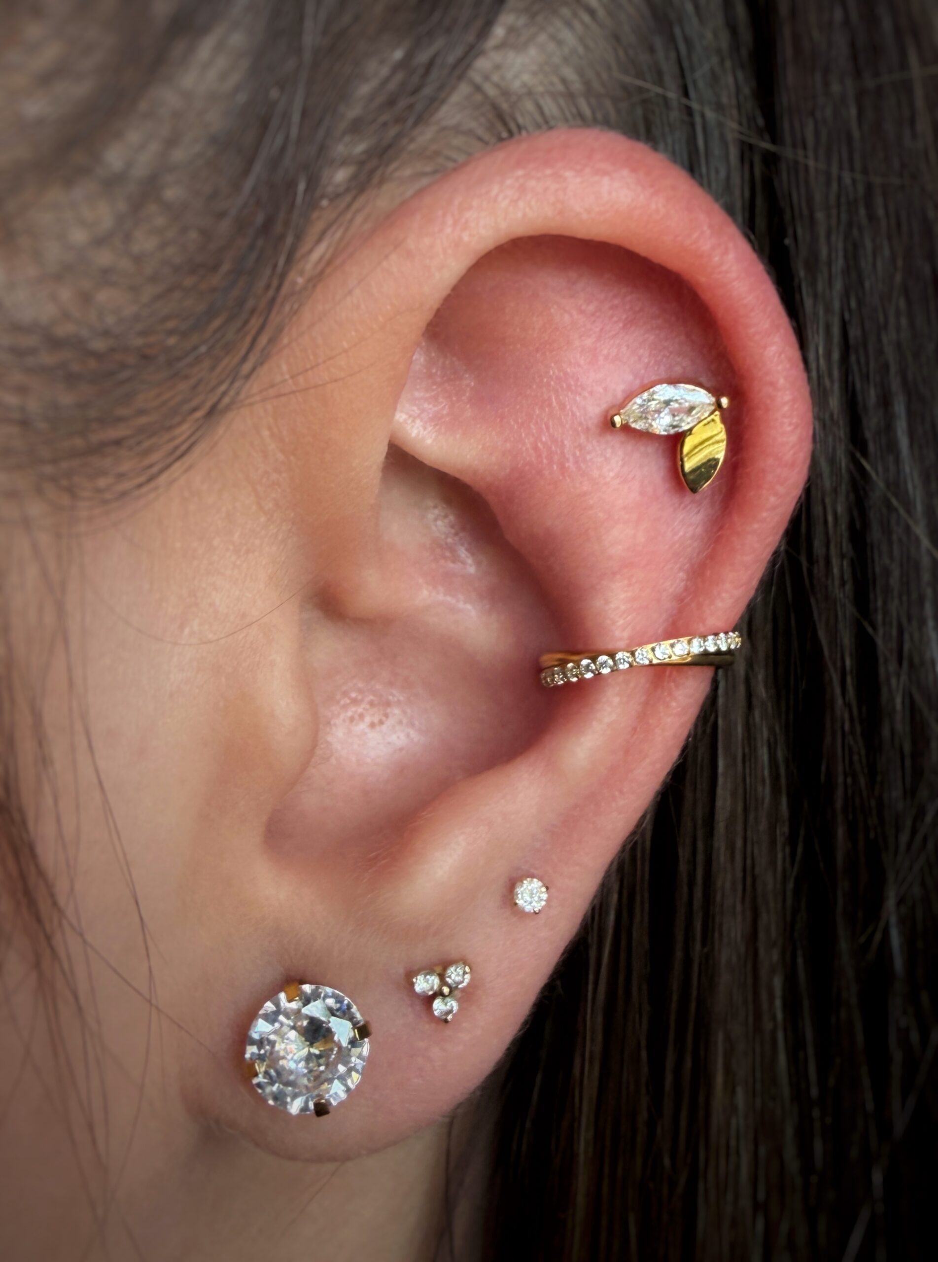Štýlový piercing s osadeným radom kryštálov zo zirkónu doplnený zaujímavými retiazkami, ktoré pekne kopírujú ucho.