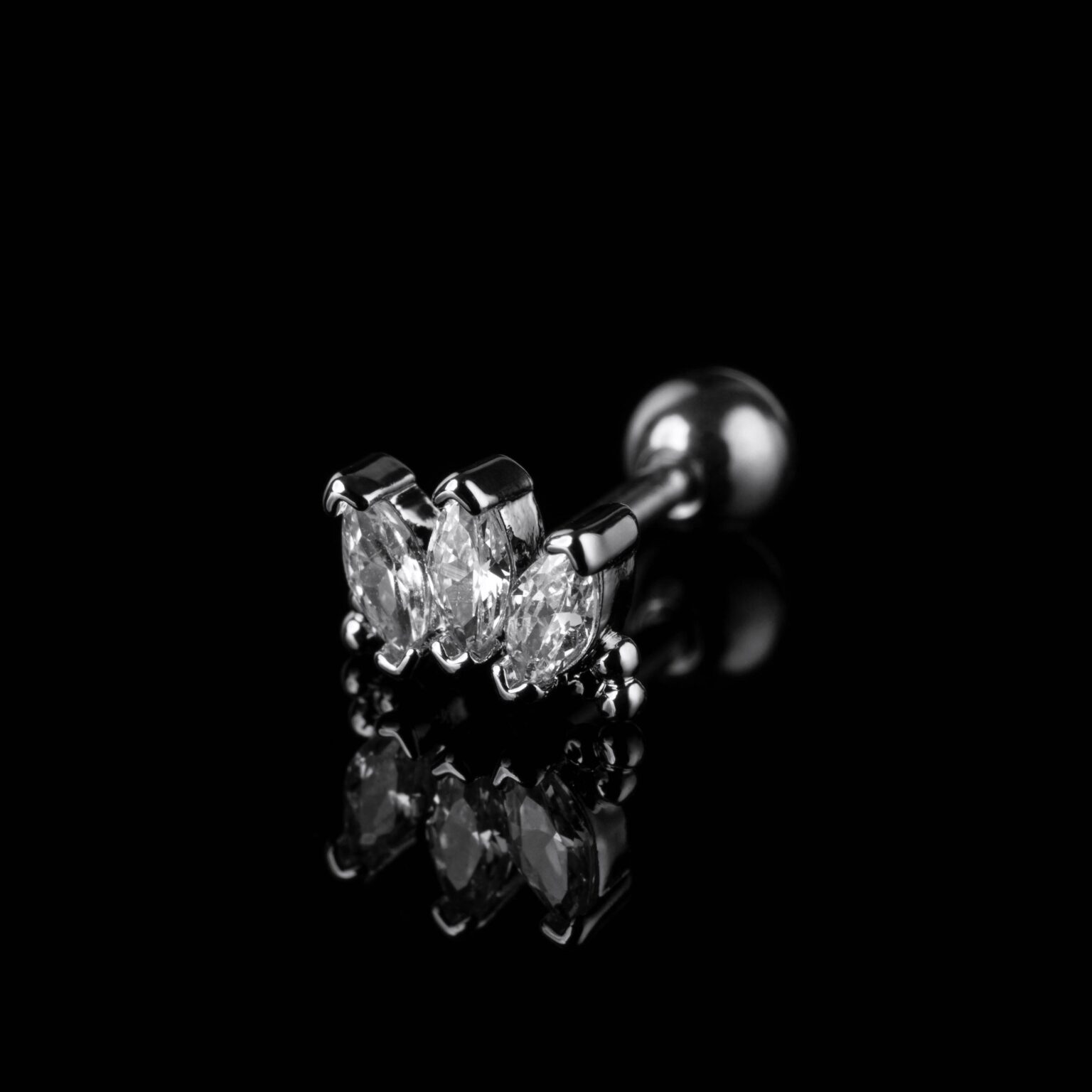 Štýlový piercing s osadeným trojitým radom kryštálov zo zirkónu. Táto obruč, navrhnutá s ohľadom na pohodlie a jednoduché použitie, je vyrobená s exkluzívnym zacvakávacím mechanizmom, vďaka ktorému je vkladanie a vyberanie veľmi jednoduché.