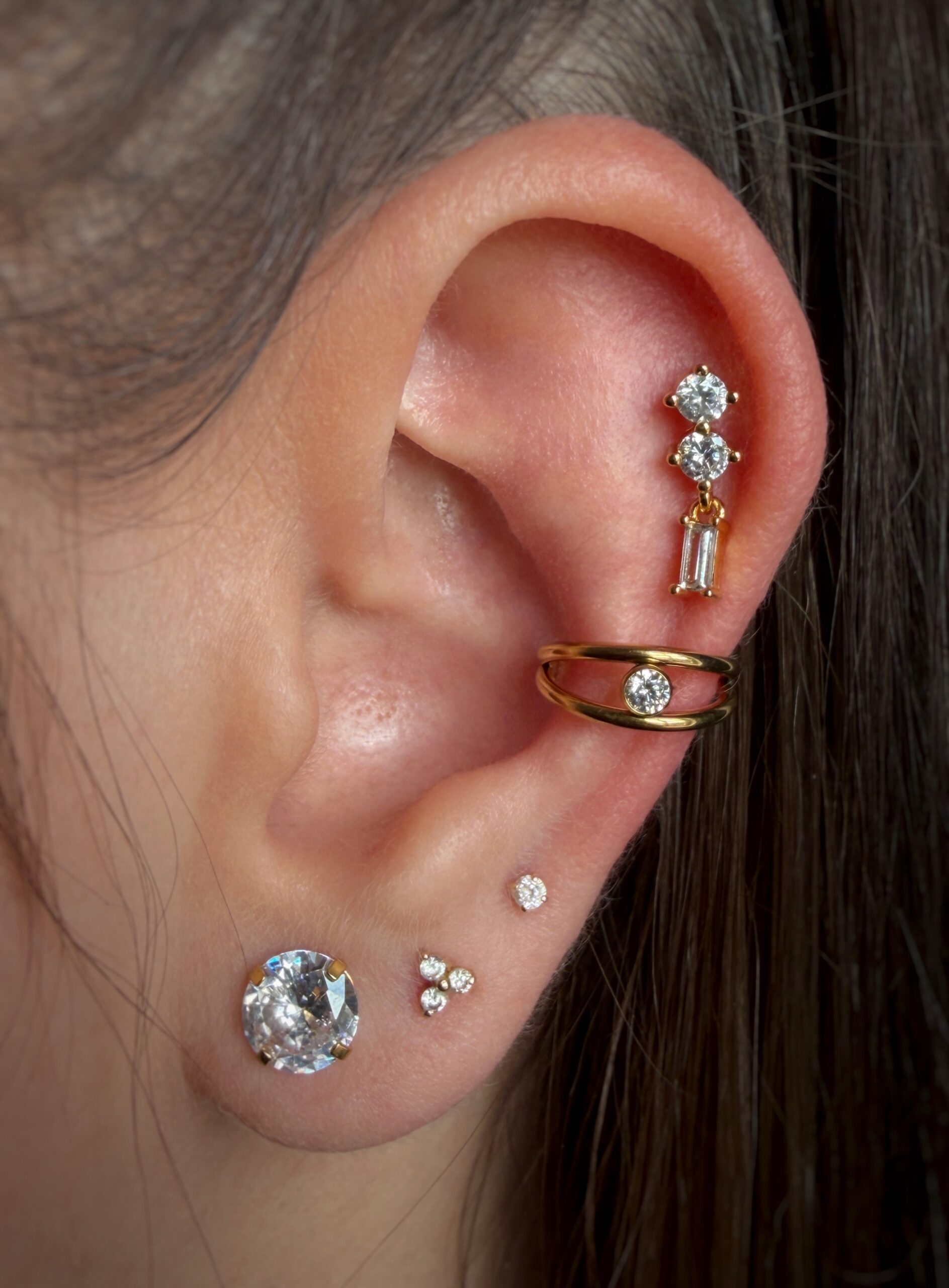 Štýlový piercing s osadeným radom kryštálov zo zirkónu doplnený zaujímavými retiazkami, ktoré pekne kopírujú ucho.